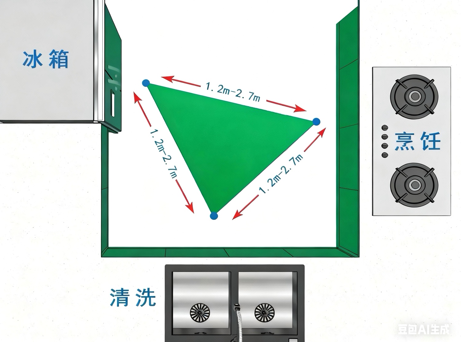 厨房动线关系到使用是否方便,黄金三角分布水槽、炉灶和冰箱组成的三角形区域要合理。三角区边长总和需在 1.2-2.7 米,单边不超过 1.8 米,这个距离更方便,不绕路。