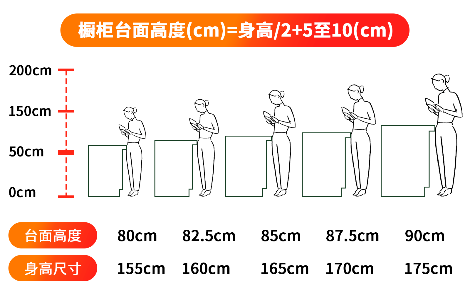 橱柜台面此前我们多次说过,高度应该按照业主身高量身定制。橱柜台面的高度是人身高的二分之一,再加上5厘米或者10厘米的距离。